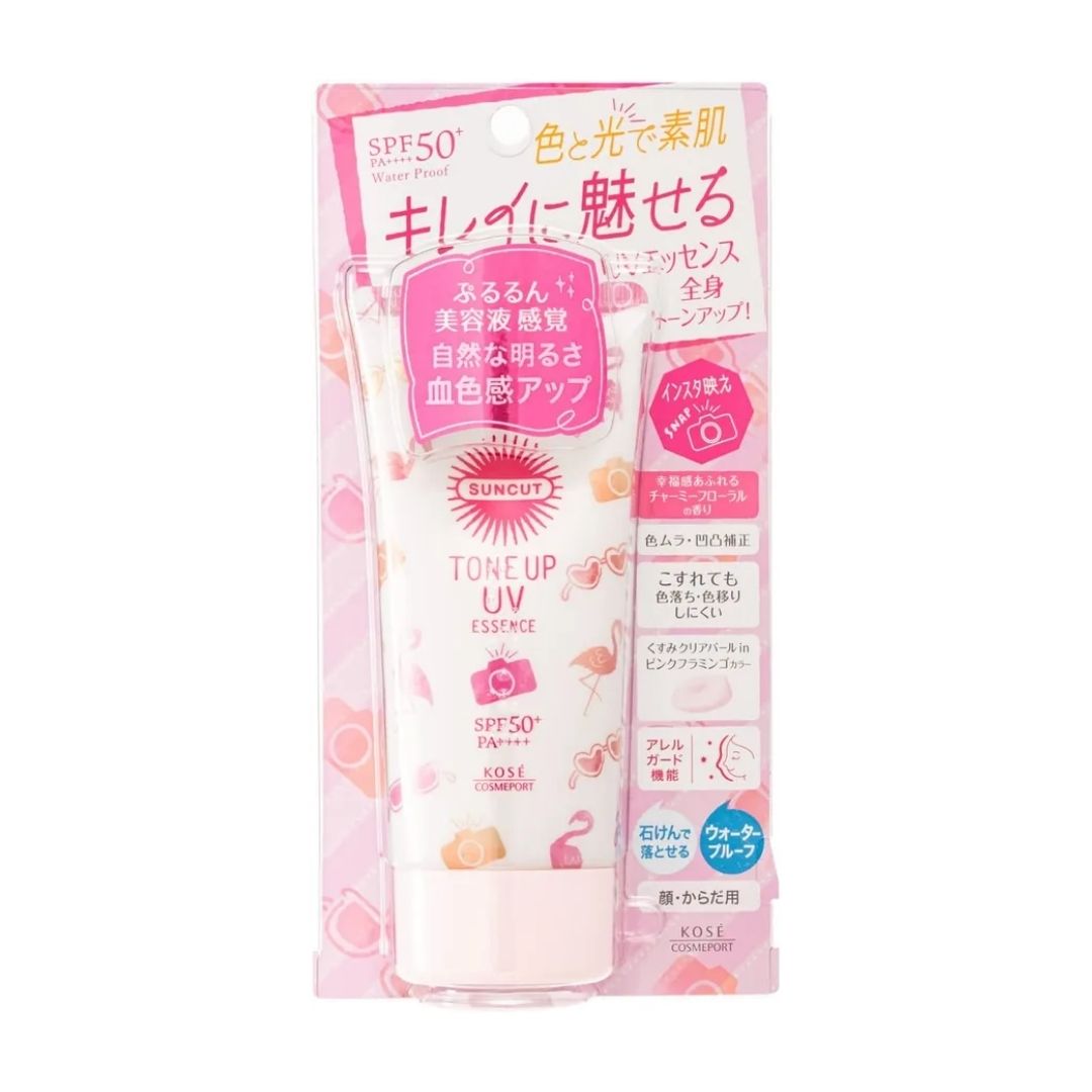 KOSE Sun Cut Tone Up UV Essence Pink Flamingo SPF50 + PA++++ is designed to brighten your complexion with a beautiful pink flamingo hue that enhances your natural blood color, giving your skin a vibrant glow. This essence can be used on the face and body, is waterproof, and can be easily removed with soap. With the highest UV cut effect of SPF50+ PA++++, it provides strong protection against UVA and UVB rays, helping to prevent stains and freckles caused by sun exposure. The unique tone-up effect corrects blue undertones, while its color-fit formula ensures that the product stays in place, even when rubbing or sweating. Additionally, it features an allergy guard function that protects the skin from environmental stressors like pollen and dust. This essence can also serve as a makeup base, enhancing foundation adherence while preventing makeup shifts, and it can be removed with soap, cleansers, or body wash.