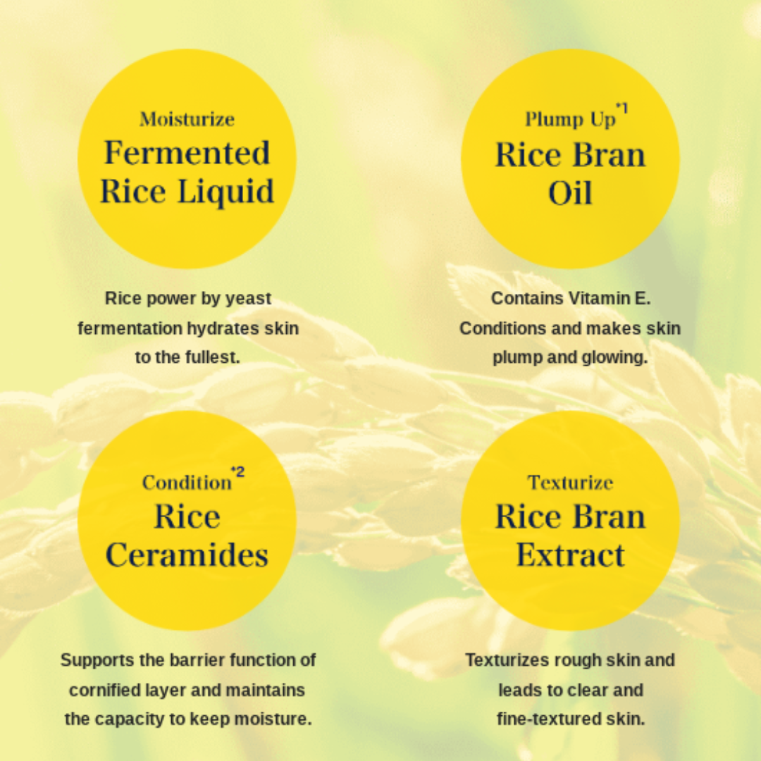 Ingredients : Water, BG, rice bran oil, glycerin, ethylhexyl palmitate, polysorbate 60, glyceryl stearate, cetanol, cyclopentasiloxane, rice fermented liquid, rice bran extract, rice bran glycosphingolipid, glycosphingolipid, archichoke leaf extract, shea butter, behenyl alcohol, Vaseline, hydrogenated lecithin, lysolecithin, carbomer, tocopherol, sodium acrylate grafted starch, potassium hydroxide, sodium hydroxide, etidronic acid 4Na, methyl paraben, propyl paraben